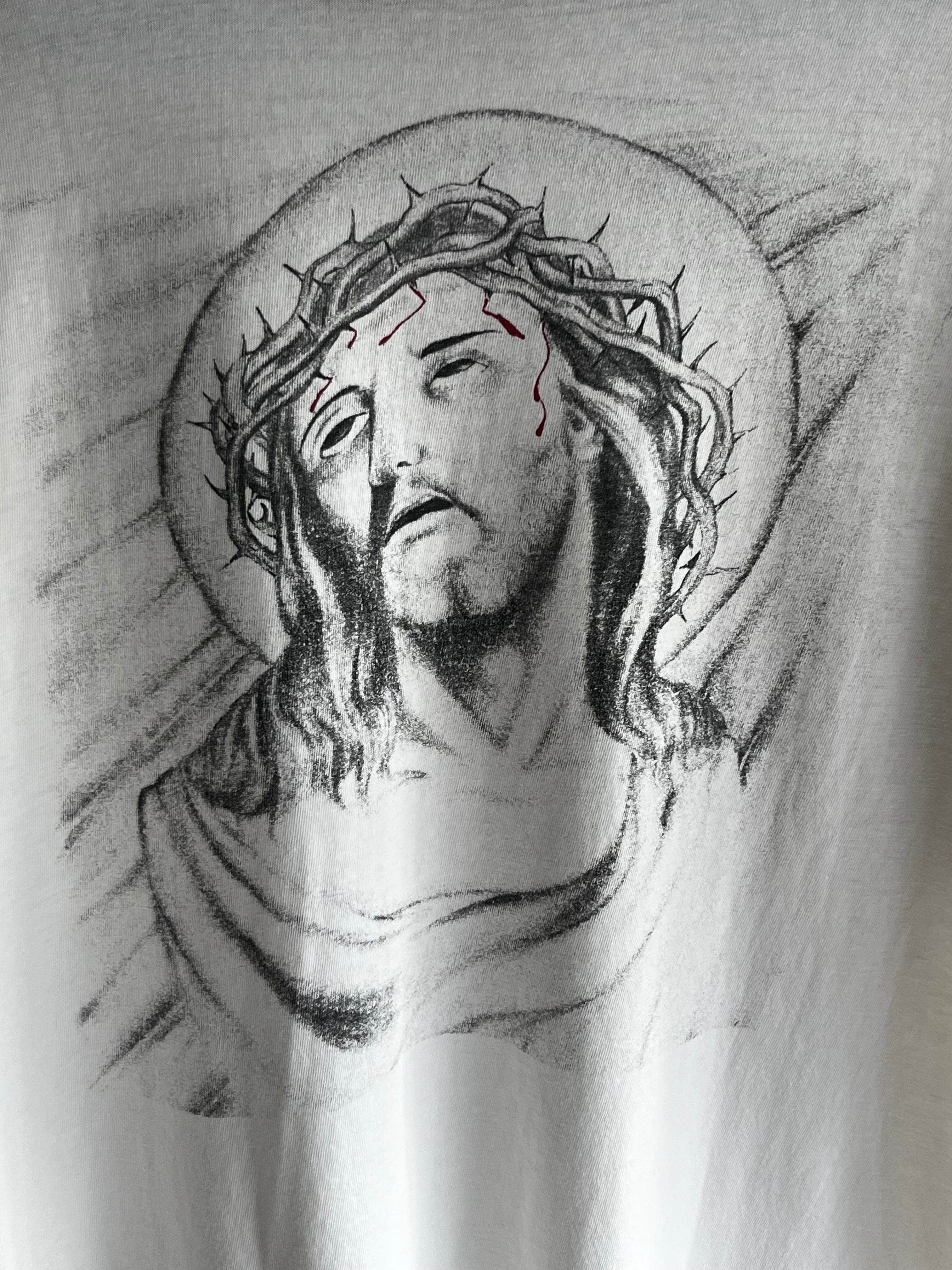 宗教的なテーマながら、どこかアートピースのような雰囲気も感じられる、独特な存在感を放つTシャツです。