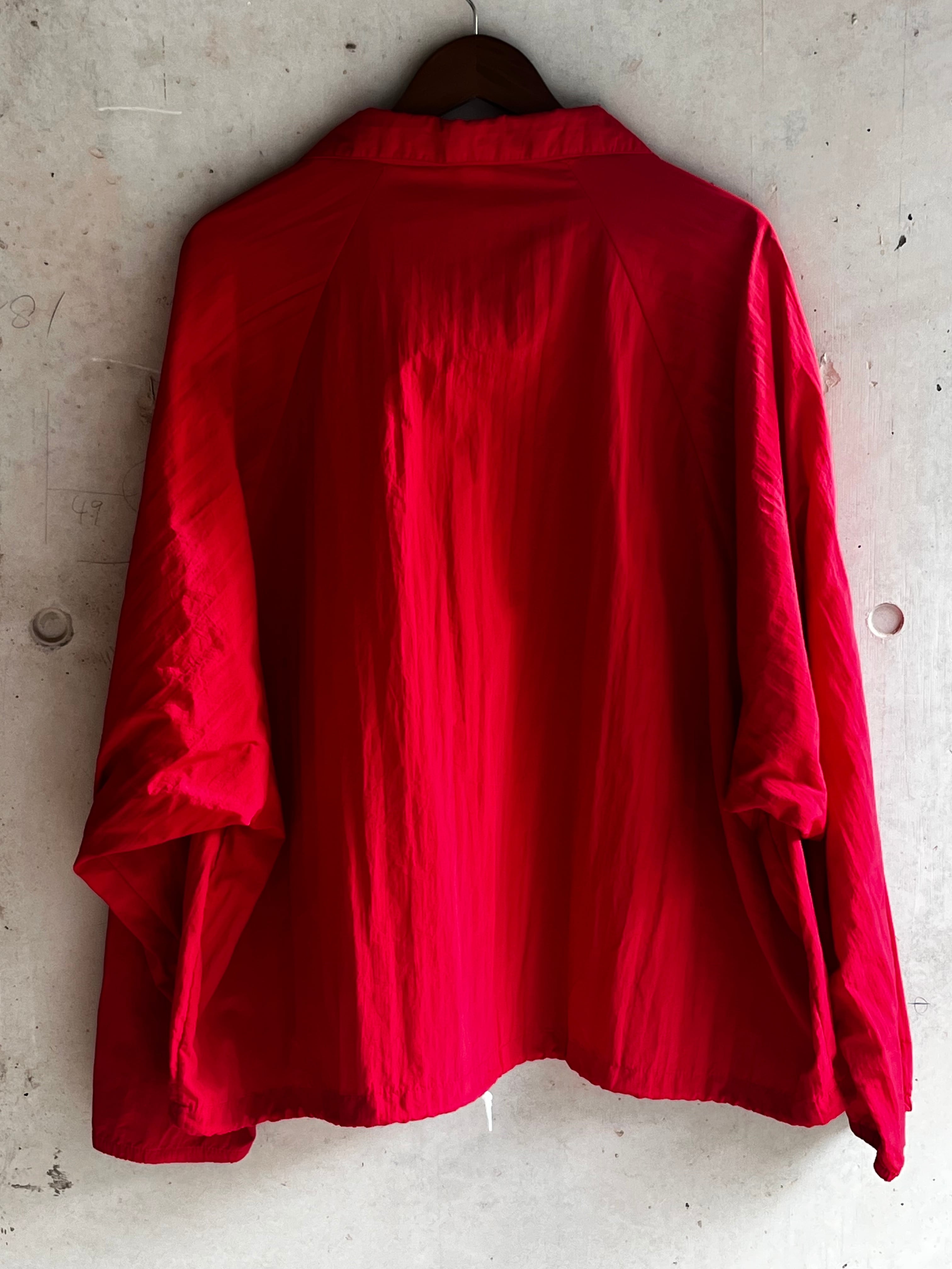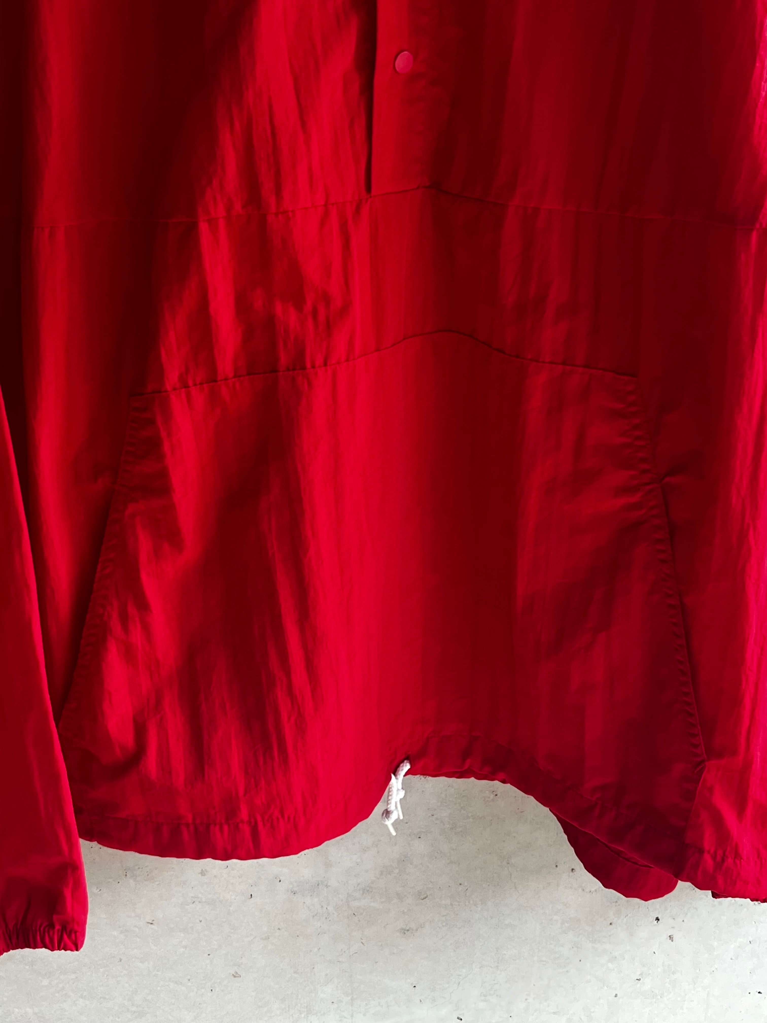 軽量で通気性の良い100%ナイロン素材を使用し、ハーフボタンやフロントのカンガルーポケット、ドローコード付きの裾など、実用性とデザイン性を兼ね備えた一着です。