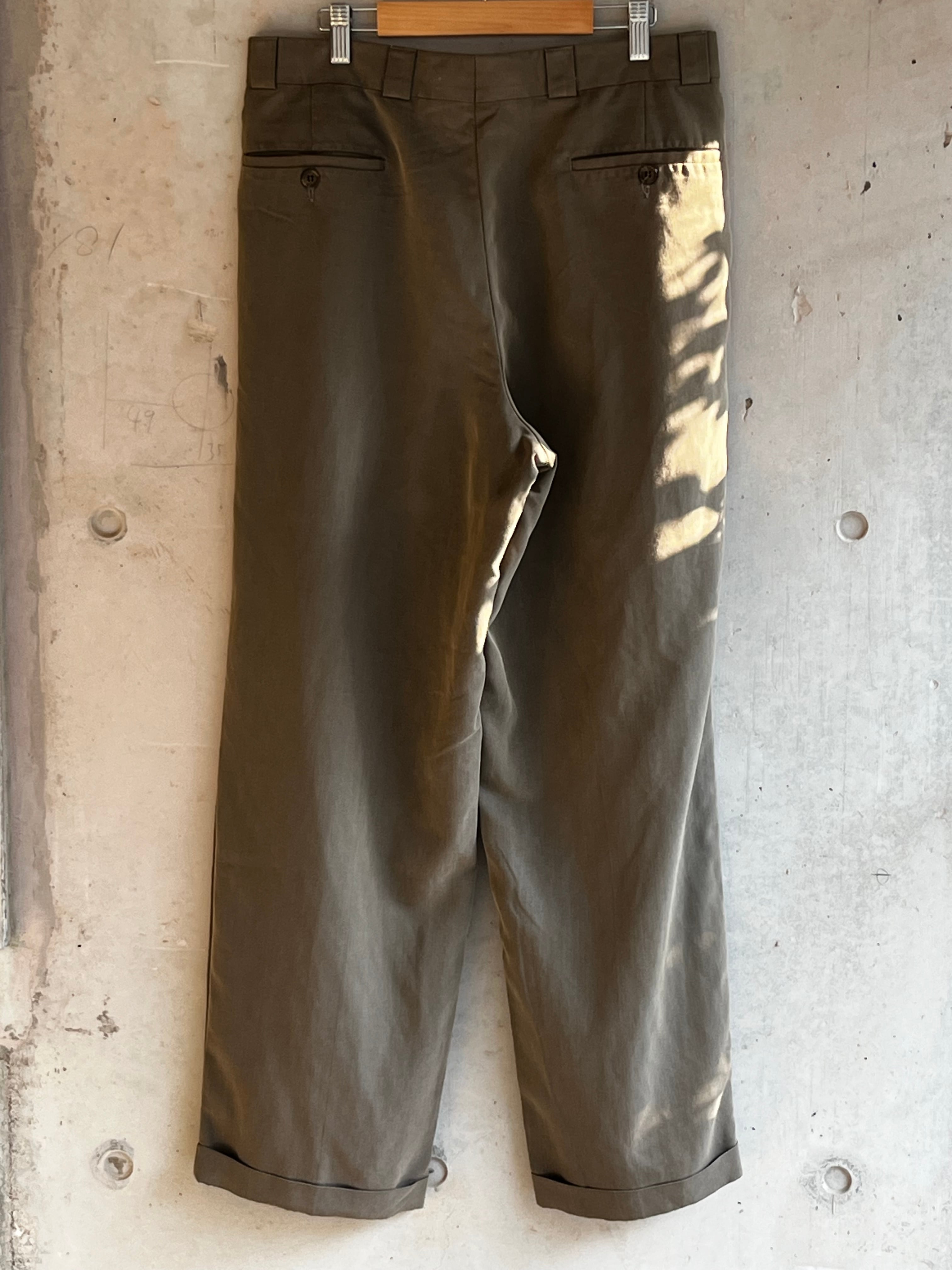 クラシカルなツータック仕様に、程よい光沢感を持つポリエステル×レーヨン混紡生地が上品な印象を演出します。