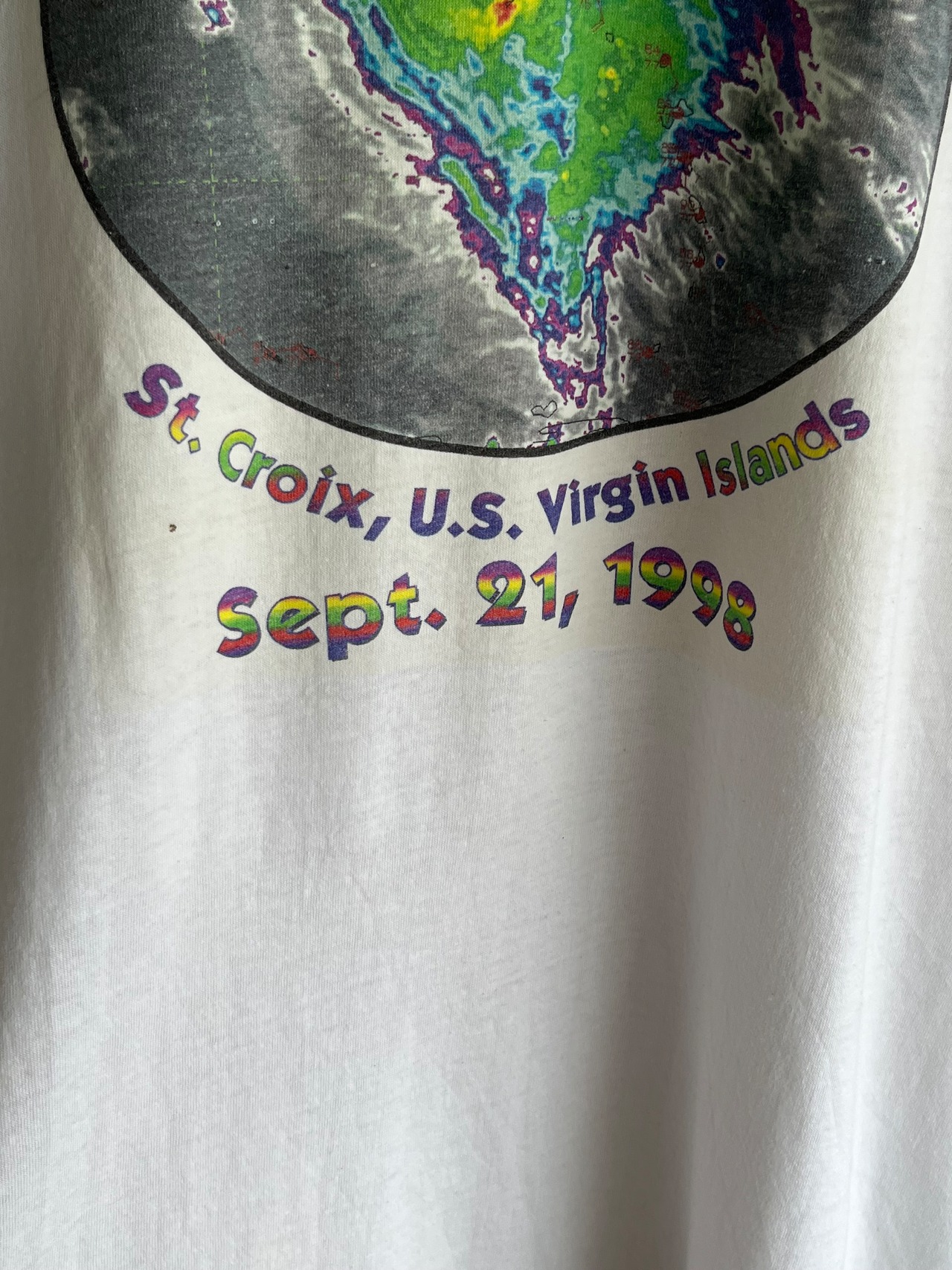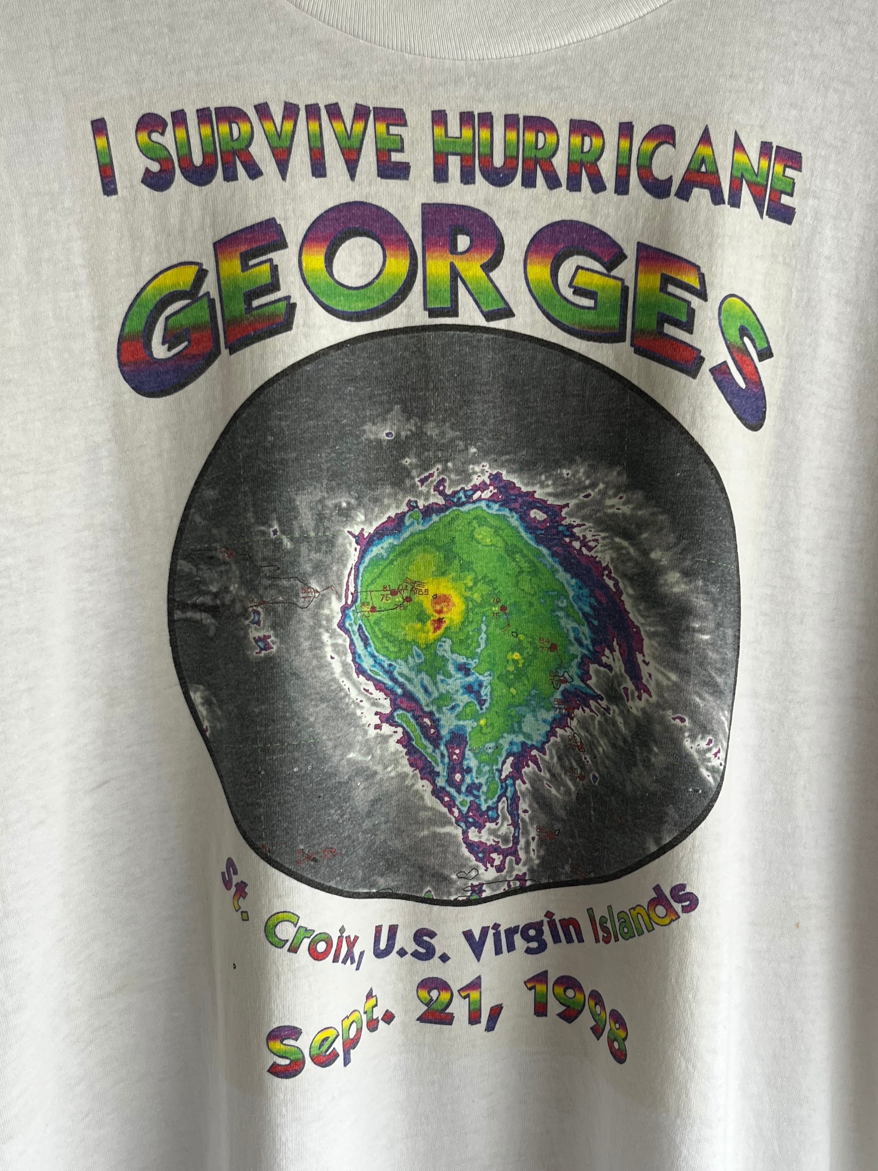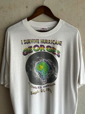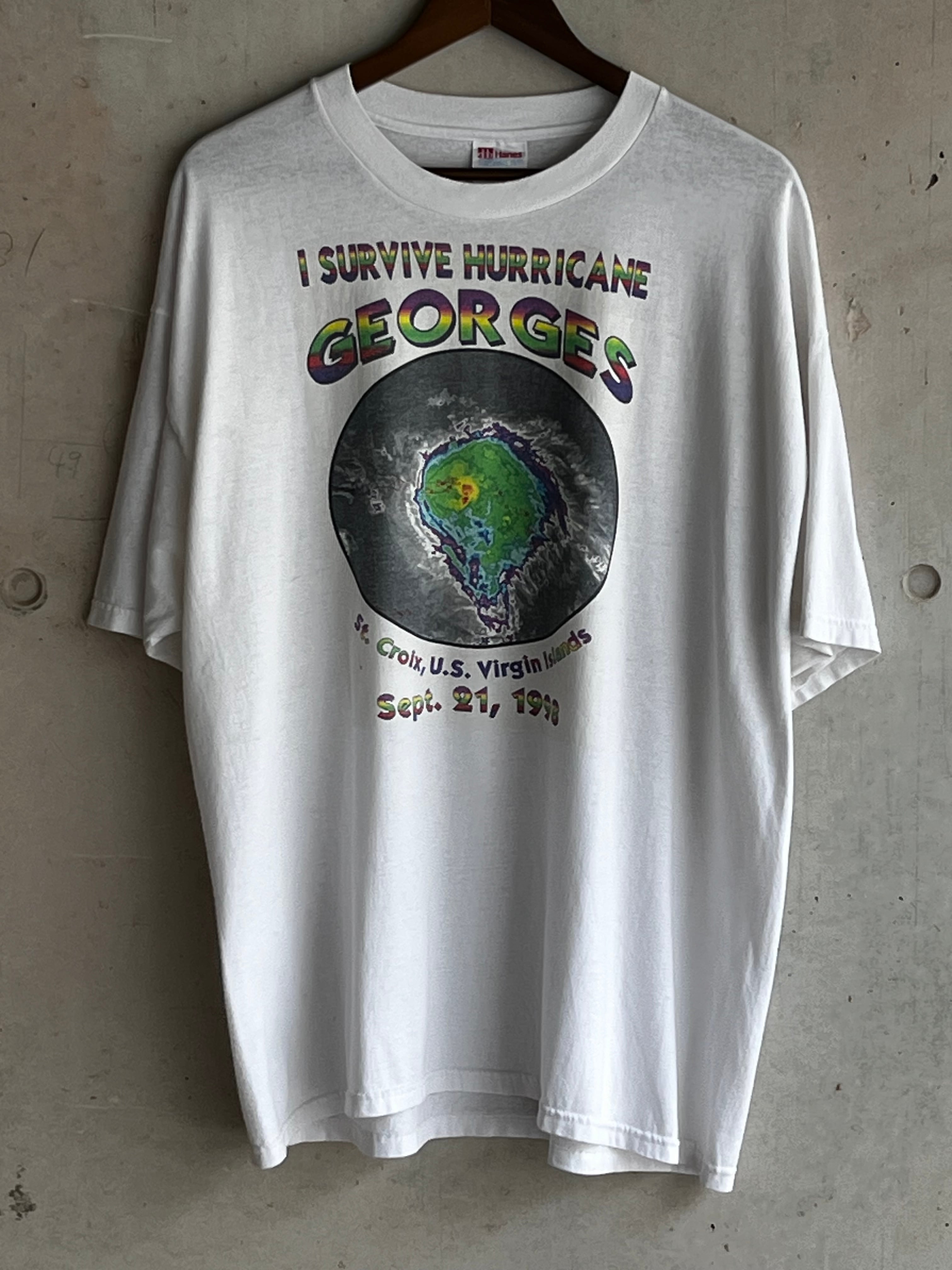 1998年9月21日にカリブ海・セントクロイ島を直撃したハリケーン「ジョージ」をモチーフにしたサバイバル記念Tシャツ。