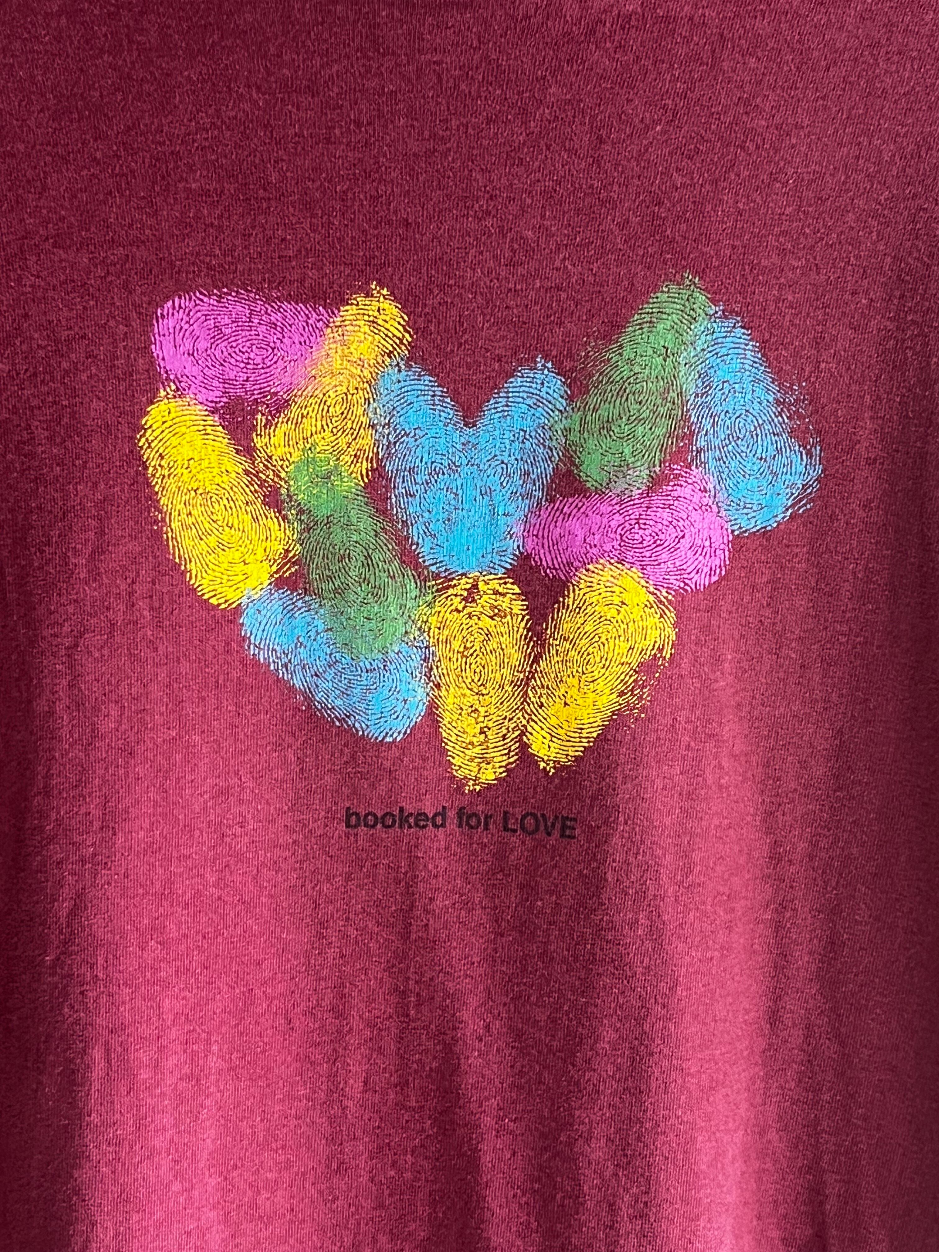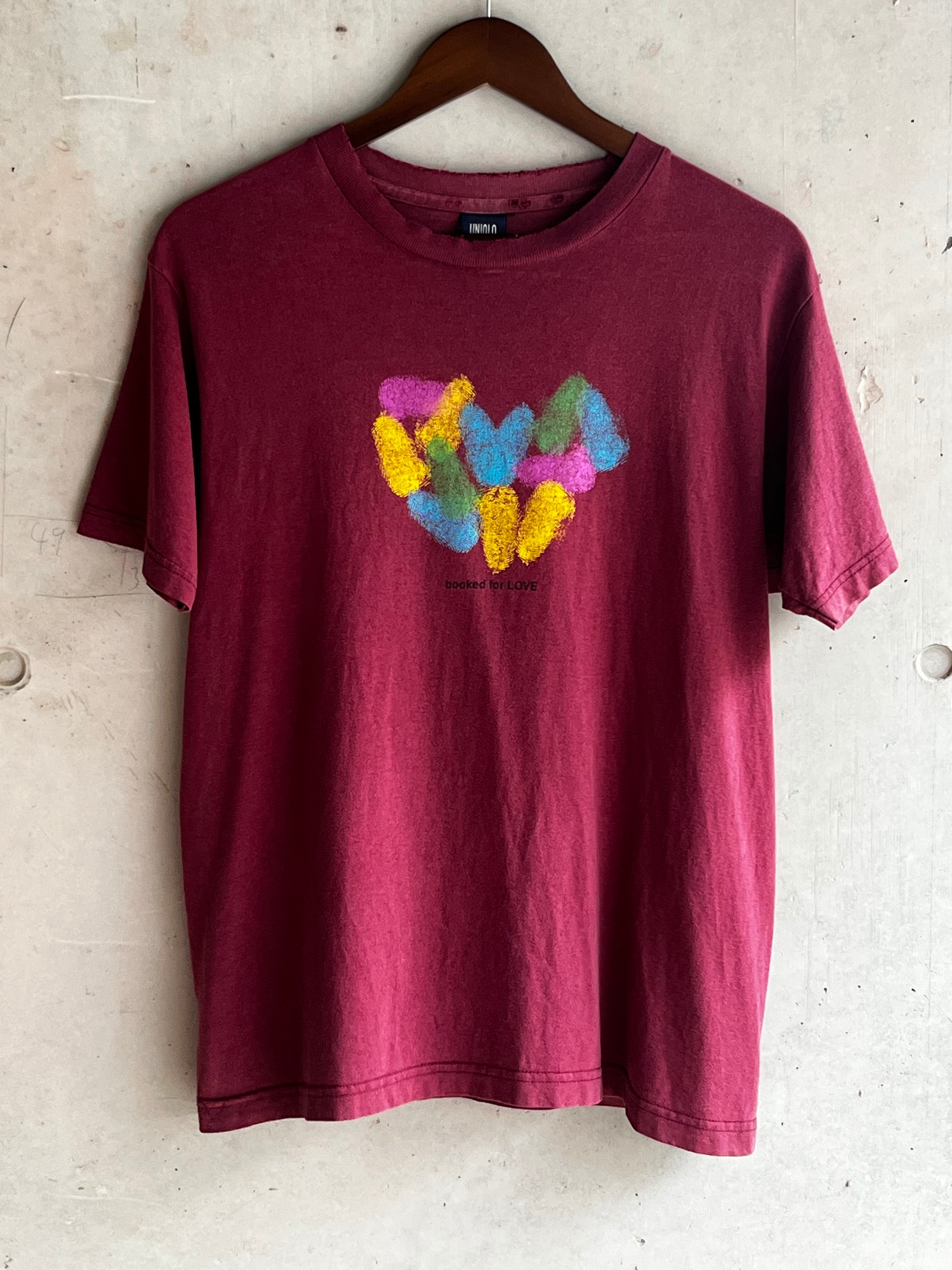 ボディはしっかりとした100%コットン。赤みがかったワインカラーに、指紋風のカラフルなグラフィックでハートを描いたポップなデザインが特徴的です。