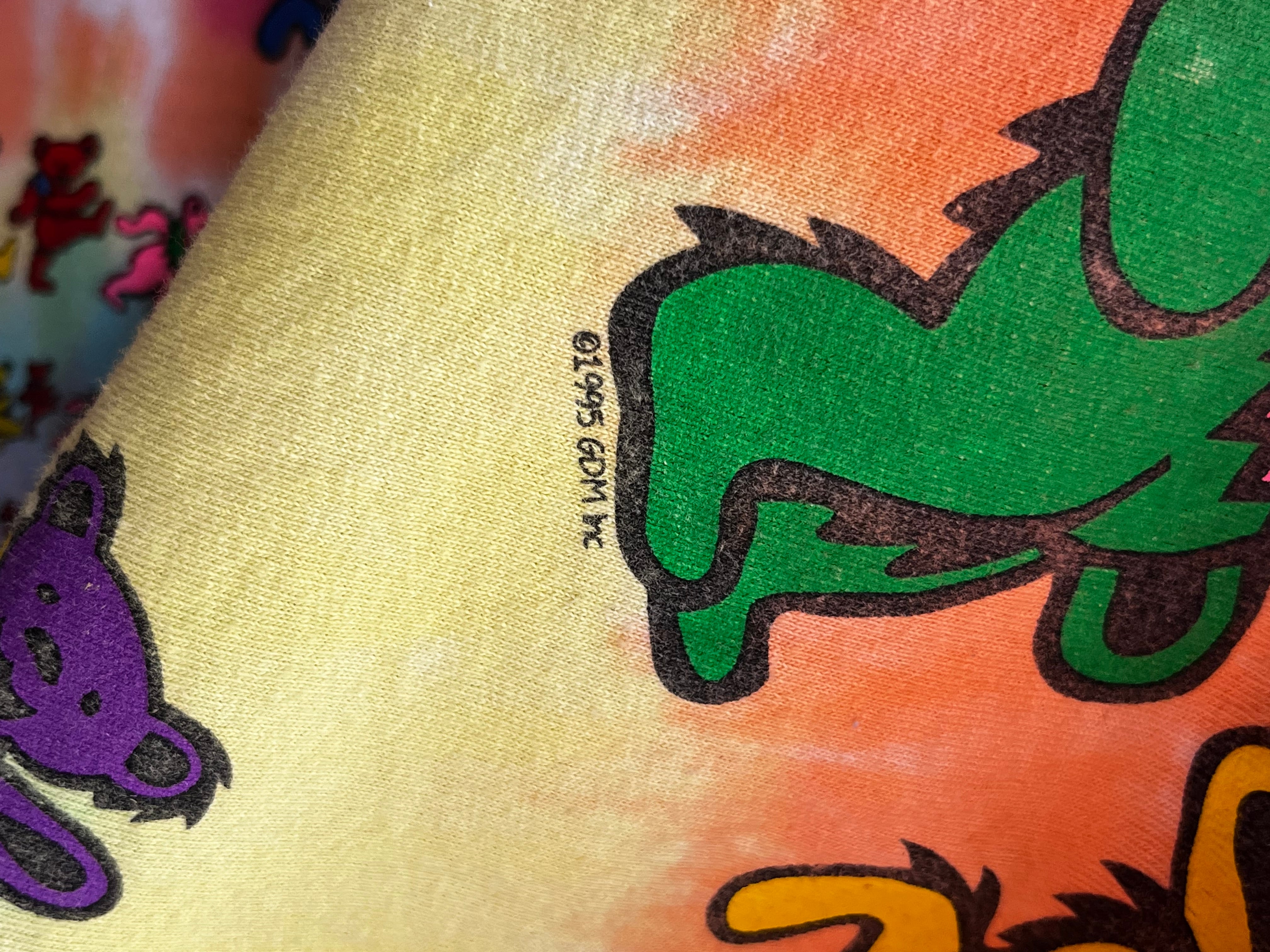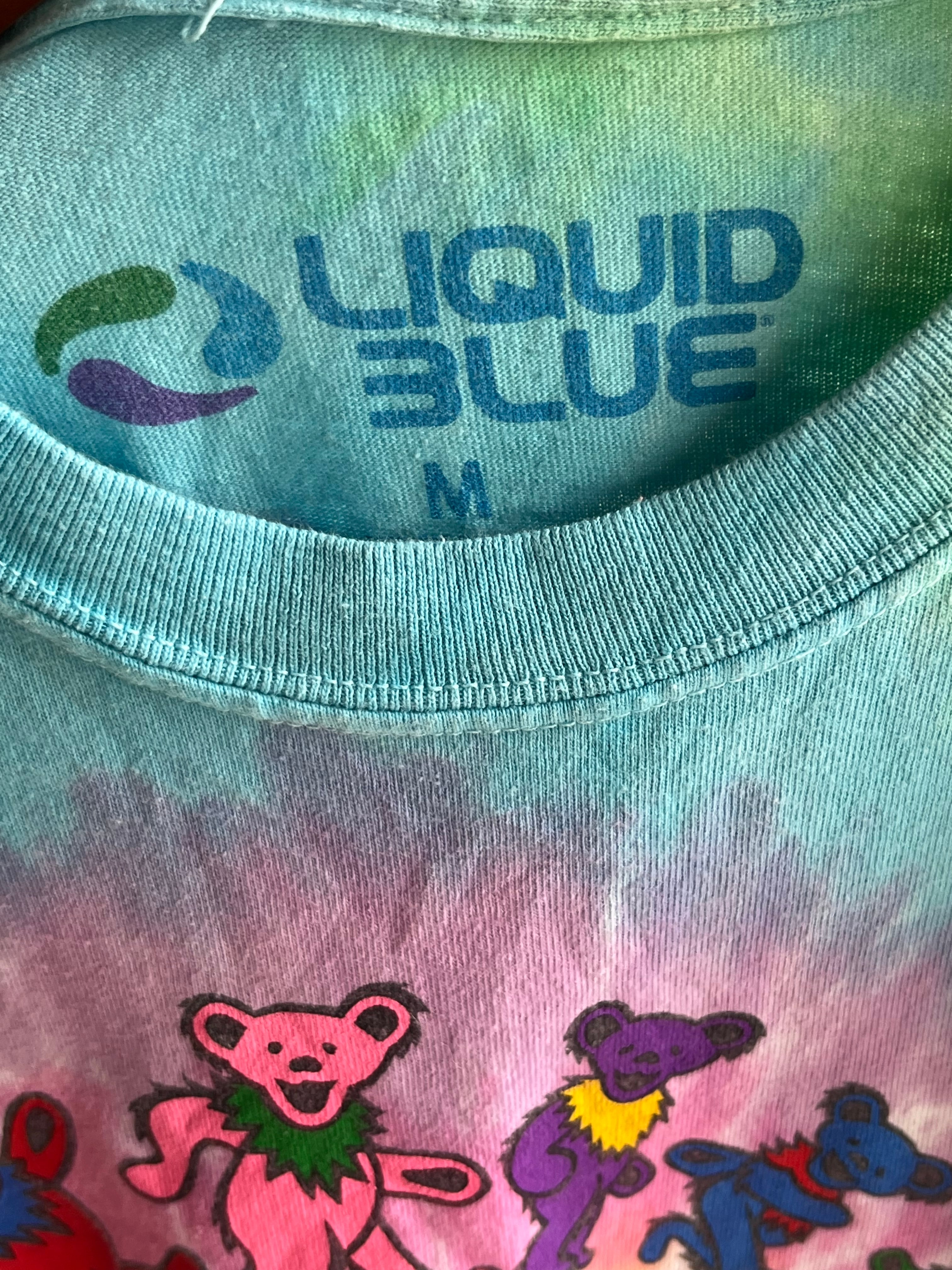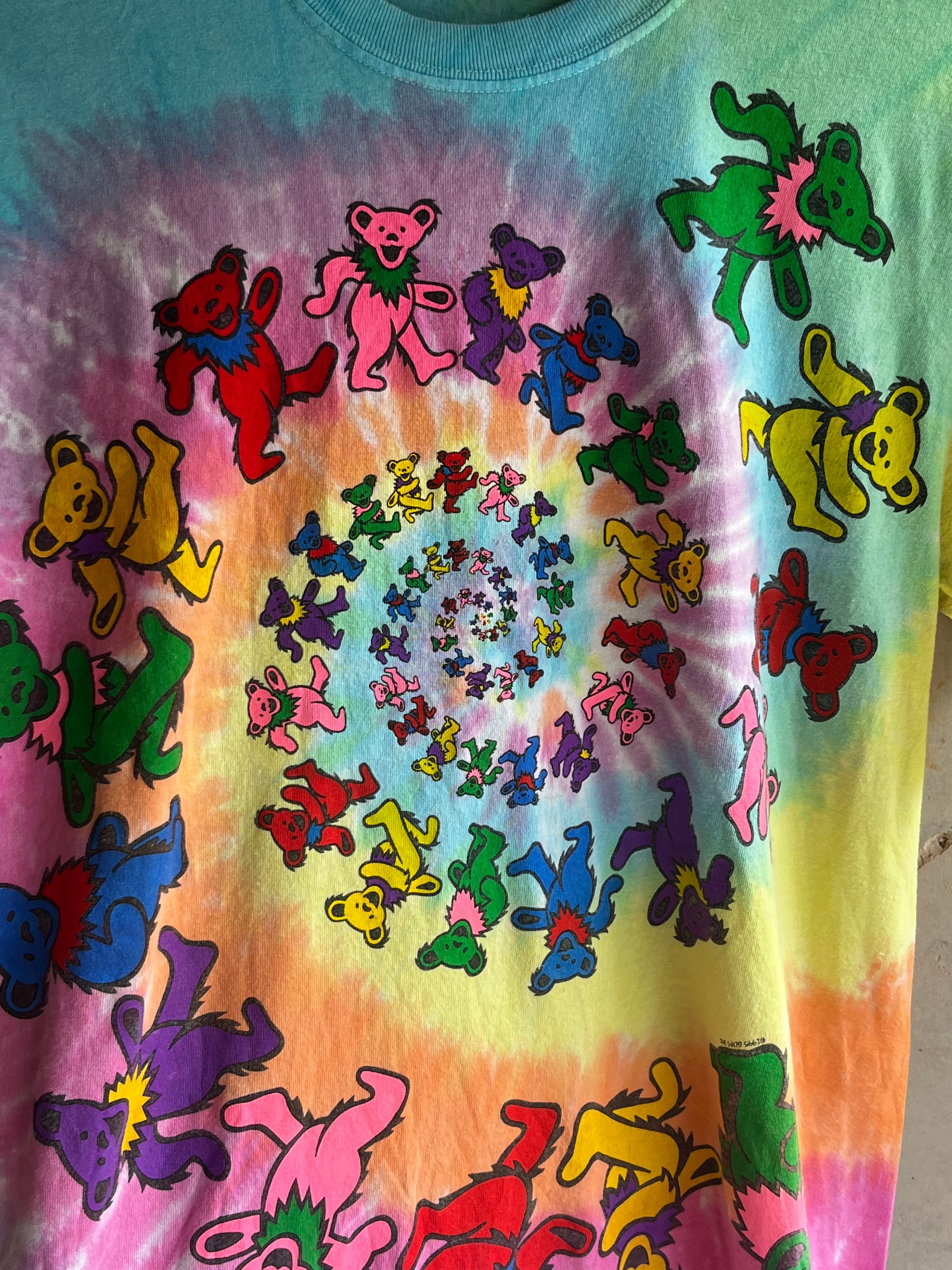 Grateful Deadの象徴的キャラクター「ダンシングベア」が、スパイラル状にぐるぐると配置された名作グラフィック。コピーライトは1995年ですが、2000年代以降に製造されたLIQUID BLUEのリプロダクト品です。